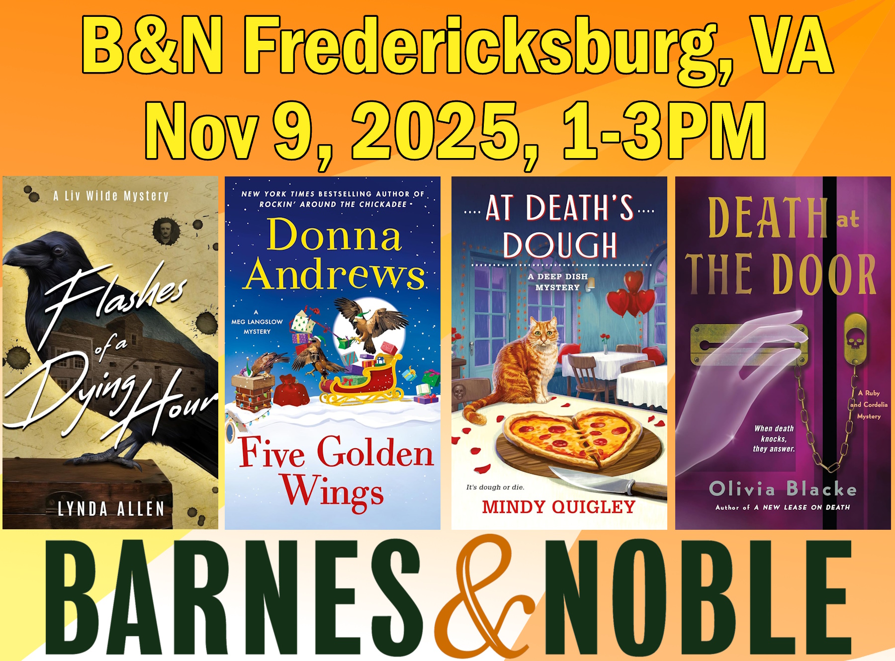 Barnes & Noble Book Signing with award-winning, Virginia-based authors Donna Andrews, Olivia Blacke, and Mindy Quigley, Sunday, November 9, 1:00-3:00 PM, in Fredericksburg, VA.