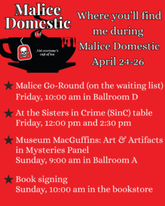 Malice Domestic Conference, April 24-26 in Bethesda, Maryland at the Bethesda North Marriott Hotel and Conference Center. Malice is a fan-based conference as opposed to a conference focused on the craft of writing. So, you’ll have opportunities to hear from a wide range of mystery authors on panels covering a variety of topics.